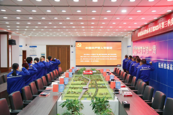 “我志愿加入中國(guó)共產(chǎn)黨,擁護(hù)黨的綱領(lǐng),遵守黨的章程……” 在黨支部書記的領(lǐng)誓下,全體黨員一同面向黨旗高舉右拳,莊嚴(yán)宣誓。黨支部書記強(qiáng)調(diào):“當(dāng)前項(xiàng)目站前工程進(jìn)度已過半,正是攻堅(jiān)沖刺的關(guān)鍵階段。全體黨員要在項(xiàng)目高標(biāo)準(zhǔn)建設(shè)、企業(yè)高質(zhì)量發(fā)展中當(dāng)標(biāo)桿、作表率,讓黨員身份在工地上閃光。”