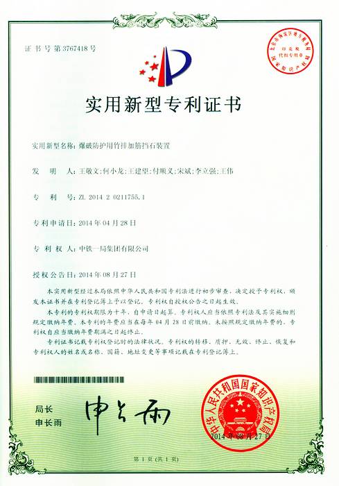 浙江杭州訊:近日,紫之隧道項目部申報的《爆破防護用竹排加筋擋石裝置》專利在國家知識產(chǎn)權(quán)局受理后已通過審查,獲得實用新型專利證書。
