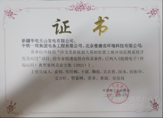 ?。ㄐ熘萦崳┙?,2025年(第二屆)能源電子產業高質量創新發展大會在江蘇徐州圓滿召開。會上,公司聯合申報的《沙戈荒新能源大基地智慧工地環境監測系統開發及應用》與《新疆華電天山北麓基地610萬千瓦新能源項目新能源智慧生產管理平臺智能感知系統》兩項案例,成功入選《能源電子(終端應用)典型案例及論文集(2025)》。