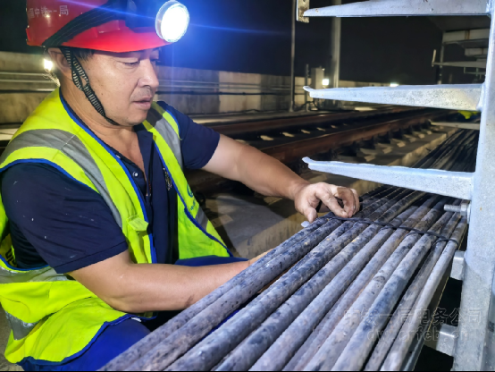 這只是七分公司信號班組夜班作業的一角。他們兵分兩路,一組在東莞西站攻堅線槽安裝與電纜綁扎,另一組奔赴同沙公園站、市民中心站開展問題克缺。從清點工具、班前安全講話,到切割時配備滅火器、接線時反復核對標識,再到收工時清理廢料、清點人員工具,每一步都像精密齒輪在咬合,沒半點含糊。