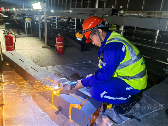 不遠處,尚冠軍握著切割機,另一只手牢牢扶住金屬線槽。砂輪剛碰到線槽,就濺起一串金色火花,在黑夜里格外耀眼。他盯著切割線上的刻度線,手腕穩得像裝了標尺:“線槽長短差一毫米,后續設備就裝不進去,返工更費時間。” 話落,他先確認切割機角度與刻度線完全對齊,再啟動機器,沿著切割線精準切下線槽成品。閃爍的火花中,他的眼神始終緊盯切口,透著一股不容差錯的認真。