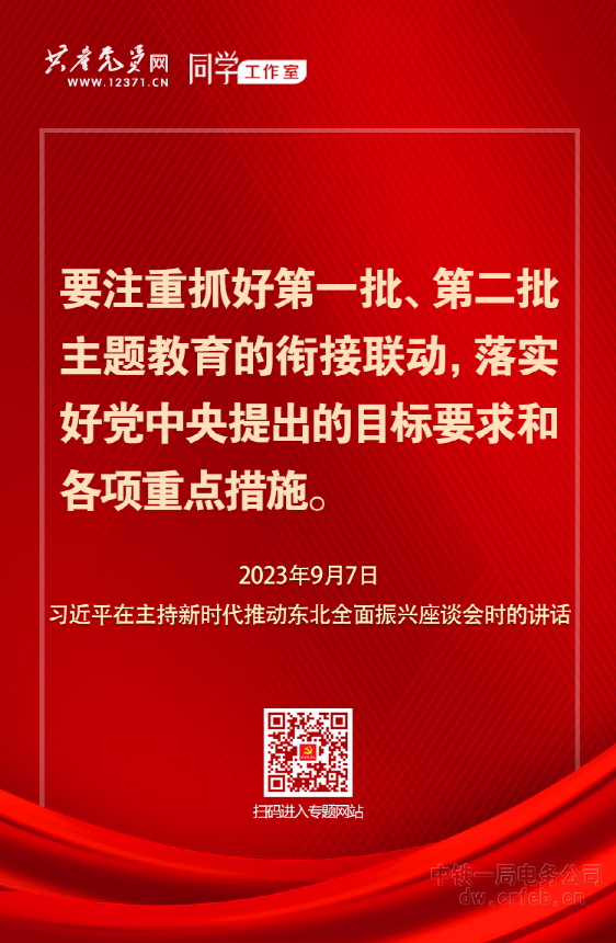 2023年9月7日,習(xí)近平總書記在主持召開新時(shí)代推動(dòng)?xùn)|北全面振興座談會(huì)時(shí)強(qiáng)調(diào),要注重抓好第一批、第二批主題教育的銜接聯(lián)動(dòng),落實(shí)好黨中央提出的目標(biāo)要求和各項(xiàng)重點(diǎn)措施。深化理論學(xué)習(xí),用新時(shí)代中國特色社會(huì)主義思想凝心鑄魂,把黨員、干部的思想和行動(dòng)統(tǒng)一到黨中央決策部署上來,增強(qiáng)信心、提振精神。大興調(diào)查研究,提高黨員、干部特別是領(lǐng)導(dǎo)干部科學(xué)謀劃工作、解決實(shí)際問題、抓好工作落實(shí)能力。著眼推動(dòng)高質(zhì)量發(fā)展,教育引導(dǎo)黨員、干部完整準(zhǔn)確全面貫徹新發(fā)展理念,貫徹以人民為中心的發(fā)展思想,以科學(xué)態(tài)度和務(wù)實(shí)精神開創(chuàng)發(fā)展新局面。加強(qiáng)檢視整改,督促黨員、干部正視和解決黨性黨風(fēng)黨紀(jì)方面的問題,以新風(fēng)正氣振奮人民群眾發(fā)展信心。