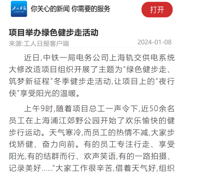 近日,中鐵一局電務(wù)公司上海軌交供電系統(tǒng)大修改造項(xiàng)目組織開(kāi)展了主題為“綠色健步走、筑夢(mèng)新征程”冬季健步走活動(dòng),讓項(xiàng)目上的“夜行俠”享受陽(yáng)光的溫暖。