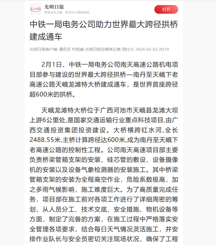2月1日,中鐵一局電務(wù)公司南天高速公路機(jī)電項目部參與建設(shè)的世界最大跨徑拱橋—南丹至天峨下老高速公路天峨龍灘特大橋建成通車,是世界首座跨徑超600米的拱橋。