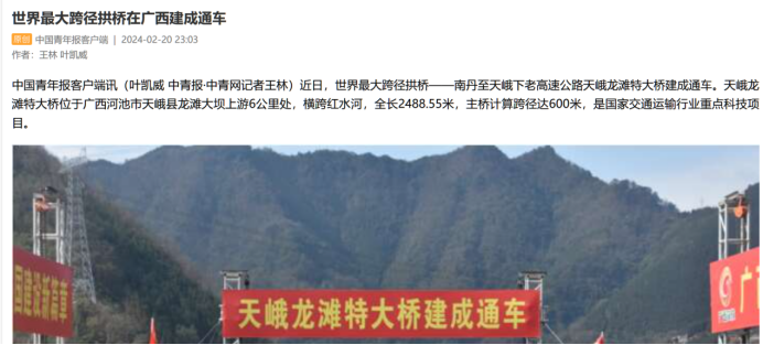 【中國青年報】世界最大跨徑拱橋在廣西建成通車