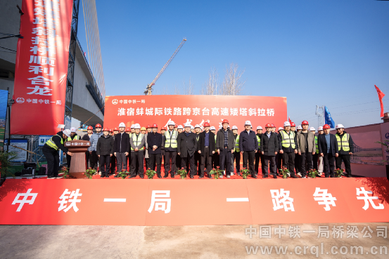 上海鐵路局合肥樞紐宿州指揮部指揮長王義寶、副指揮長武佩峰;宿州市發改委副主任李望濤;中鐵上海設計院集團淮宿蚌城際鐵路配合施工指揮部指揮長王建春;鐵四院(湖北)工程監理咨詢有限公司淮宿蚌三標監理站副總監曾德奎;中鐵一局橋梁高級專家、副總工程師閔擁軍,華東管控組副組長郭應忠,八公司執行董事、黨委書記秦定松,淮宿蚌III標項目經理張偉,八公司副總經理史維康等在現場見證合龍。