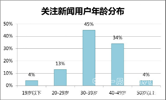 通過上圖可以看出來(lái),關(guān)注新聞的用戶主要集中于30歲到49歲的區(qū)間,屬于中青年人階層。這代人大多是80后以及70后,更多的關(guān)注的是所處行業(yè)的行業(yè)資訊以及國(guó)際民生等類型的新聞,同比對(duì)于其他類型的新聞關(guān)注度一般不會(huì)太高,因此要獲得廣泛良好的宣傳效果,首先必須要讓自己企業(yè)深入人心,然后對(duì)于企業(yè)有了良好的認(rèn)知以后有了關(guān)注以后,企業(yè)的所有的宣傳工作在社會(huì)范圍內(nèi)形成廣面效應(yīng)。