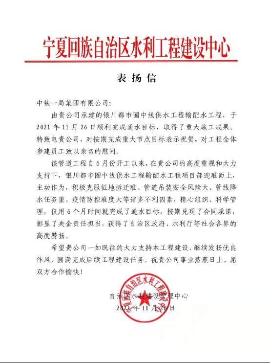 寧夏回族自治區水利工程建設中心表揚信