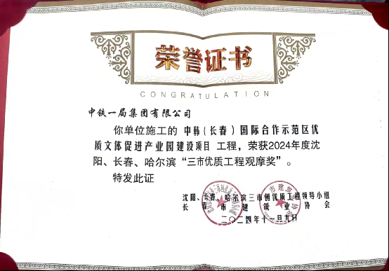 11月9日,由公司承建的中韓(長春)國際合作示范區(qū)優(yōu)質文體促進產業(yè)園建設項目榮獲2024年度沈陽、長春、哈爾濱“三市優(yōu)質工程觀摩獎”。