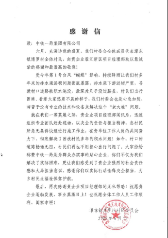 近日,中鐵一局接連收到兩份特殊的“禮物”:蓉江新區(qū)項(xiàng)目部收到潭東鎮(zhèn)博羅村委會(huì)送來的錦旗與感謝信,大上崇項(xiàng)目獲社溪鎮(zhèn)麻田村委會(huì)贈(zèng)予的錦旗。這兩面錦旗與感謝信,既是村民對項(xiàng)目團(tuán)隊(duì)工作的肯定,更是對公司踐行社會(huì)責(zé)任、心系群眾需求的高度認(rèn)可。