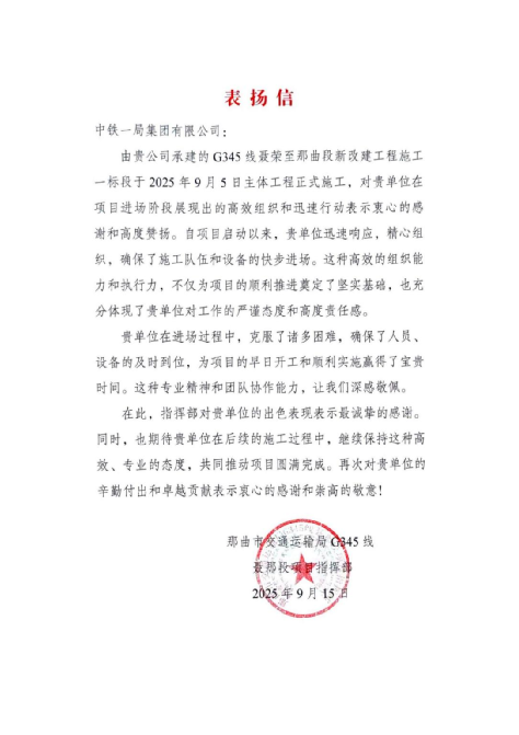 近日,那曲市交通運輸局G345線聶那段項目指揮部發(fā)來表揚信,對中鐵一局在G345國道聶榮至那曲段改建工程項目中的卓越表現(xiàn)予以肯定,表揚公司在項目進場階段高效組織、迅速行動,確保了施工隊伍和設備的快步進場,為項目的順利推進奠定了堅實基礎。