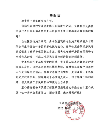 近日,中鐵一局贛州蓉江新區(qū)排水單元整治項(xiàng)目圓滿結(jié)束了當(dāng)塘村的社區(qū)改造施工,當(dāng)塘村村民委員會(huì)送來錦旗和感謝信,對(duì)項(xiàng)目在社區(qū)改造施工中的專業(yè)表現(xiàn)和辛勤付出表示感謝,并贊揚(yáng)項(xiàng)目部的高效執(zhí)行力與專業(yè)施工組織能力。