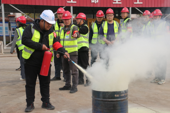 演練前,安質(zhì)部負(fù)責(zé)人講解演練具體流程,并對(duì)干粉滅火器、滅火球、消防栓水帶等消防器材的使用方法進(jìn)行培訓(xùn)。準(zhǔn)備工作就緒后,上午9時(shí)30分,洞庭路站施工現(xiàn)場(chǎng)著火,施工人員發(fā)現(xiàn)火情后立即上報(bào)項(xiàng)目負(fù)責(zé)人,啟動(dòng)消防應(yīng)急預(yù)案,應(yīng)急領(lǐng)導(dǎo)小組宣布火災(zāi)事故應(yīng)急演練開(kāi)始。搶險(xiǎn)組人員立即跑到指定地點(diǎn),提取消防器材對(duì)火源進(jìn)行撲滅,應(yīng)急救援組分析事故現(xiàn)場(chǎng)情況。