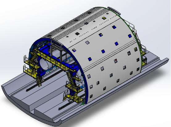 在精準(zhǔn)定位方面,臺(tái)車借助平板集成控制系統(tǒng)與同步液壓技術(shù),實(shí)現(xiàn)毫米級(jí)精準(zhǔn)定位與剛性鎖緊,就像給設(shè)備裝上了“精準(zhǔn)導(dǎo)航系統(tǒng)”;采用的環(huán)梁模板與大節(jié)點(diǎn)門架設(shè)計(jì),構(gòu)建起超高剛度的承載體系,確保施工過(guò)程中穩(wěn)如磐石;針對(duì)灌注環(huán)節(jié),臺(tái)車創(chuàng)新性引入六自由度機(jī)械臂,嚴(yán)格執(zhí)行分層逐窗的標(biāo)準(zhǔn)化灌注工藝,避免了傳統(tǒng)人工灌注的隨機(jī)性問(wèn)題。目前,機(jī)械臂系統(tǒng)已完成多版優(yōu)化,正在廠內(nèi)通過(guò)明洞隧道仿真場(chǎng)景進(jìn)行工況模擬,為后續(xù)在七里村隧道出口及其他項(xiàng)目的應(yīng)用積累數(shù)據(jù)。同時(shí),臺(tái)車預(yù)留了機(jī)械臂安裝接口,可根據(jù)實(shí)際施工需求靈活選配,大幅提升了設(shè)備的通用性。