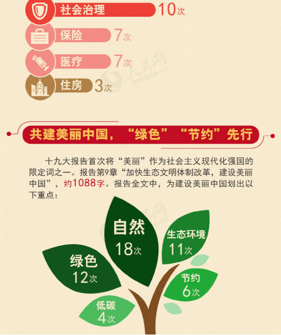 十九大報告首次將“美麗”作為社會主義現代化強國的限定詞之一。報告第9章“加快生態文明體制改革,建設美麗中國”,共1088字。報告全文中,為建設美麗中國劃出以下重點: