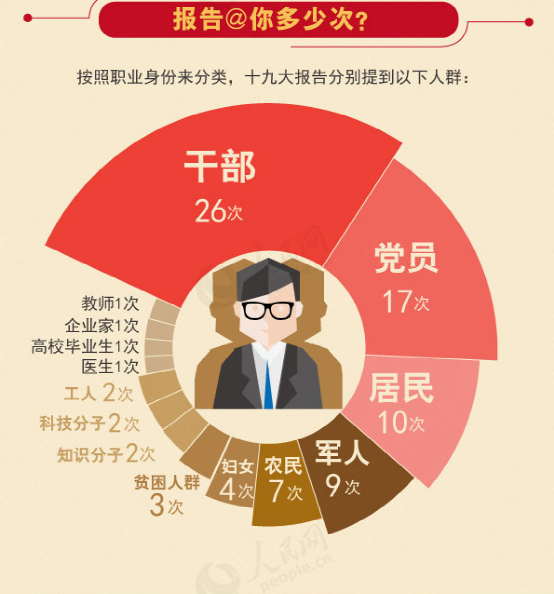 干部26次,黨員17次,居民10次,軍人9次,農民7次,婦女4次,貧困人群3次,知識分子2次,科技分子2次,工人2次,醫生1次,高校畢業生1次,企業家1次、教師1次。