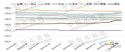 2019 年3月,全國六大區(qū)域水泥行情分化,漲跌互現(xiàn)。西北和華北地區(qū)價(jià)格上漲,西北領(lǐng)漲,由于冬儲(chǔ)優(yōu)惠的結(jié)束,水泥價(jià)格回漲,3 月環(huán)比大漲4.82%;華北行情基本保持穩(wěn)定,其他四大區(qū)域價(jià)格環(huán)比下滑。東北、中南地區(qū)月內(nèi)持續(xù)下滑,當(dāng)月分別環(huán)比下滑1.22%和2.38%,東北地區(qū)停窯結(jié)束,需求恢復(fù)緩慢,遼寧價(jià)格有所下滑;中南地區(qū)受陰雨天氣、部分地區(qū)需求下滑等影響,多數(shù)地區(qū)價(jià)格均在下滑。華東和西南月初下滑,下旬見底后已回漲,當(dāng)月環(huán)比小幅下滑0.57%和0.04%,華東地區(qū)已止跌回漲,長(zhǎng)三角即將開啟第一輪普漲;西南方面,隨著天氣的好轉(zhuǎn)需求環(huán)比回升,月底四川已開始推漲,預(yù)計(jì)下月華東和西南將會(huì)呈現(xiàn)漲勢(shì)。