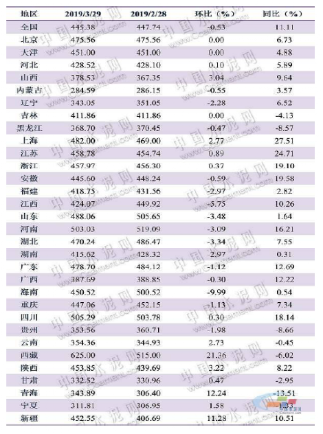 2019年3月末,全國P.O42.5散裝水泥均價(jià)為445.38元/噸,環(huán)比微跌-0.53%,同比漲幅為11.11%。本月價(jià)格環(huán)比上漲的?。ㄊ校┯?3 個(gè),漲幅最大的是西藏地區(qū),環(huán)比大漲21.36%;價(jià)格環(huán)比下跌的?。ㄊ校┯?5 個(gè),其中海南跌幅最大,環(huán)比下滑了9.99%;其余3個(gè)省(市)價(jià)格行情無變動(dòng)。