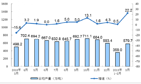 據(jù)國家統(tǒng)計(jì)局?jǐn)?shù)據(jù),2019年3月份,全國規(guī)模以上工業(yè)企業(yè)生產(chǎn)水泥17971萬噸,同比大增22.2%。1-3月累計(jì),生產(chǎn)水泥39160萬噸,同比增長(zhǎng)9.4%。3月份,全國水泥日均產(chǎn)量579.7萬噸,同比減少81.5萬噸,降幅16.4%;環(huán)比增長(zhǎng)220.7萬噸,增幅61.5%。