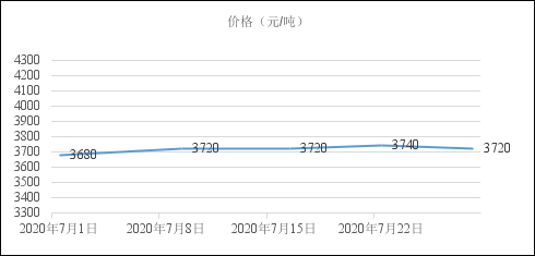 2020年7月份國內建筑鋼價震蕩走高,截止7月31日,西本鋼材指數收在3890,較上月末上漲80。下圖為西安地區(qū)螺紋鋼HRB400EФ20mm價格走勢。